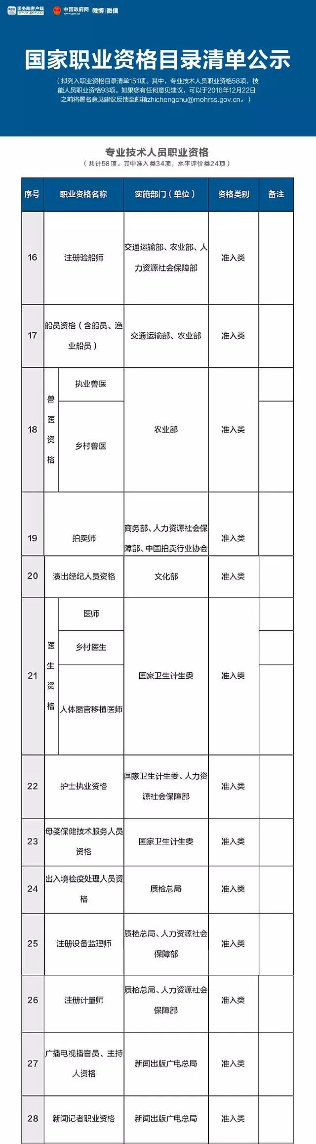 就在这个月的16号,人力资源和社会保障部公示了国家职业资格目录清单,拟列入职业资格目录清单151项。其中,专业技术人员职业资格58项,技能人员职业资格93项。