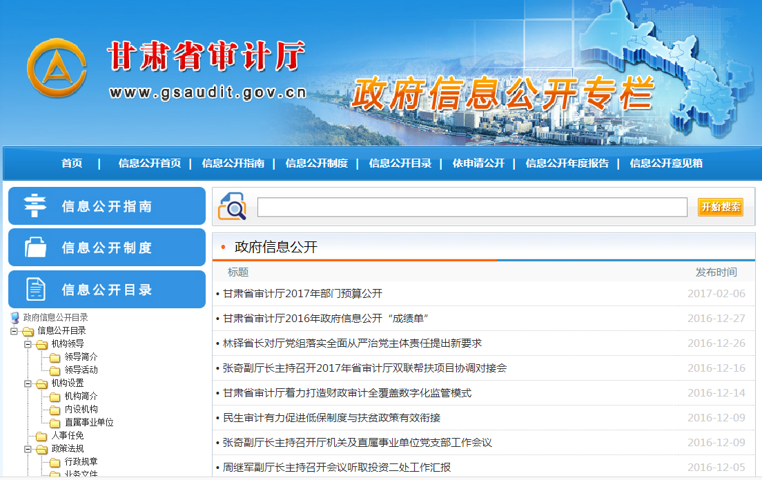 2016年,甘肃省审计厅紧紧围绕省委、省政府中心工作及公众期盼,《政府信息公开条例》和《甘肃省2016年政务公开工作要点》的要求,积极推行政府信息公开,通过拓展信息公开载体、规范信息公开程序、丰富信息公开内容,主动提供信息公开服务,使人民群众、被审计单位和社会各界更加了解、关心、支持和促进审计工作,增强了审计监督的威慑力,保证了审计信息的准确性、公开性、透明性,确保了社会对审计工作的知情权、参与权、监督权,为充分发挥审计的“免疫系统”功能起到了积极的促进作用。