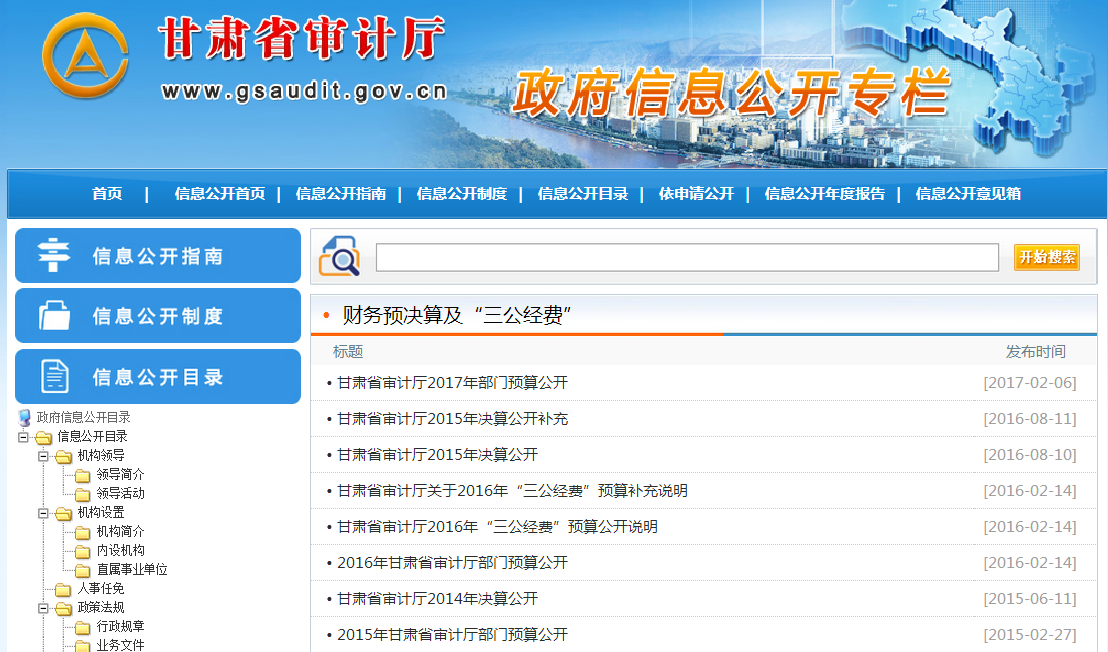 (二)公开的主要内容。在日常工作中,我厅根据不同的内容、性质、要求、对象公开有关审计信息。一是公开审计部门的基本情况。包括机构简介、内设机构、工作职能、办公地点、联系电话(含投诉电话)、领导名录及分工、人事任免等。二是公开与审计相关的政策法规。包括与审计相关的行政规章、审计机关制发的规范性文件、工作制度与规则、业务流程、职业规范、工作守则、审计纪律、廉政勤政制度规定、政策解读等。三是公开财政预决算和“三公经费”。根据《2016年政务公开工作要点》,及时公开2015年度部门决算、2016年度部门预算及2016年度“三公”经费预算信息。四是公开审计结果公告。在《甘肃日报》、省审计厅门户网站公开了甘肃省2015年度省级预算执行和其他财政收支审计结果公告、甘肃省2015年度省级预算执行和其他财政收支审计查出问题整改情况的公告和关于16个国外贷援款项目审计结果的公告。五是公开单位重要事项。包括审计工作重点、审计执法情况、重要活动、重大事项、领导活动、涉及审计机关职责范围内群众关心的热点问题和重点工作等。六是公开群众意见和建议的处理结果。包括社会各界、人民群众对审计机关的意见、建议及其处理情况。七是公开群众关心的其他重要事项。包括审计工作中涉及经济发展和社会进步的重大问题、人民群众关心的热点问题、影响改善经济发展环境的关键问题。