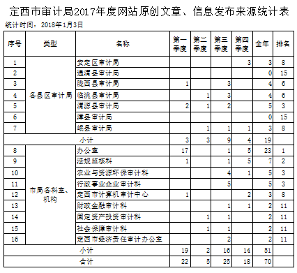 2017年度,全市各级审计机关围绕审计署、省、市审计工作会议精神积极开展审计工作,报送了大量贴近审计工作的消息、理论文章、工作动态、审计现场图片等类型稿件。网站全年采用原创文章和信息70件,其中采用市局各科室51件,各县区19件。
